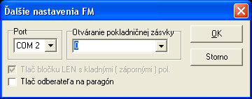 Po kliknutí na tlačítko Ďalšie nastavenia zadajte nastavenia fiškálnej tlačiarne: