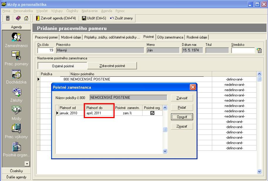 V pracovnom pomere vyberte Poistné -> Ostatné poistné a nastavte sa napr. na položku číslo 800 - Nemocenské poistenie. Pravým tlačítkom myši, alebo kliknutím na danej položke otvoríte nové okno Poistné zamestnanca a ukončite platnosť poistného tak, aby korešpondovala s dátumom ukončenia pracovného pomeru zamestnanca t.j. 04/2011. Rovnako postupujte aj pri ostatných poistných, ukončite platnosť poistného tak, aby parameter "Platnosť do" bol uvedený 04/2011.